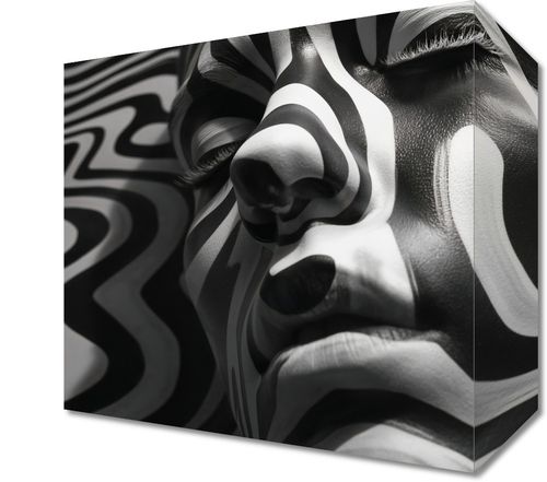 Obraz z serii abstrakcja zatytułowany Wtop Się We Mnie. Ten monochromatyczny obraz przedstawia zbliżenie na twarz kobiety, której skórę zdobią hipnotyzujące, czarno-białe wzory przypominające zebry. Skontrastowane linie zygzakowato przecinają płaszczyznę obrazu, tworząc złudzenie ruchu i głębi. Obraz jest przykładem wyrafinowanego połączenia sztuki portretowej z abstrakcyjnym designem, idealny do pomieszczeń o minimalistycznym lub nowoczesnym wnętrzu, takich jak galerie sztuki, nowoczesne biura, a także jako oryginalny akcent w domowym salonie. Jego unikalny styl przyciąga wzrok i zmusza do refleksji, stanowiąc idealny temat do rozmów w przestrzeniach społecznych.