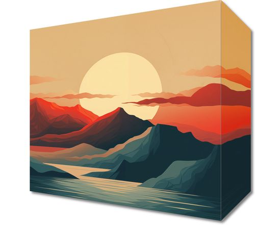 Obraz z serii pejzaże zatytułowany Zachód Słońca nad Górami. Ten graficzny obraz przedstawia stylizowany krajobraz górski o zachodzie słońca, z dominującymi ciepłymi odcieniami czerwieni i pomarańczy, które kontrastują z spokojnymi tonami ciemnego morza. Harmonia kolorów i płynne linie nadają kompozycji spokojny, ale zarazem wyrazisty charakter. Doskonale sprawdzi się jako centralny punkt w każdym pomieszczeniu, wprowadzając element ukojenia i inspirującej natury. Idealny dla tych, którzy pragną dodać do swojego wnętrza nutę artystycznego spokoju.