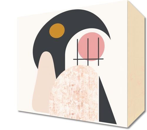 Obraz z serii boho zatytułowany Zakres Widoku.Obraz przedstawia abstrakcyjną kompozycję łączącą kształty zakrzywione i geometryczne, wykorzystującą miękką i spójną paletę kolorów. Dominujące kolory to czarny, odcienie różu, beż oraz akcent żółtego, tworząc poczucie równowagi i nowoczesnej estetyki. Kompozycja składa się z nakładających się form, w tym dużej czarnej figury z wycięciem koła, przez które prześwituje część różowego koła, oraz żółtego koła umieszczonego w obszarze czarnym, co może sugerować ciało niebieskie typu księżyc lub słońce. Obecne są również elementy fakturalne, dodające głębi i intrygi jednemu z kształtów, a proste linie przecinają różowe koło, przyczyniając się do wizualnego zainteresowania dziełem. Całość kompozycji przekazuje spokojne i współczesne wrażenie, prawdopodobnie czerpiąc inspirację z natury i sztuki abstrakcyjnej.