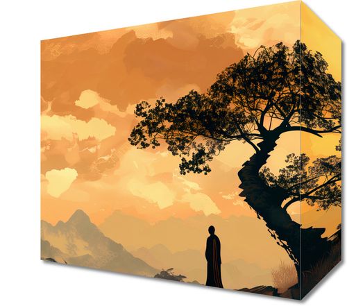 Obraz z serii motywy wschodnie zatytułowany Zen. Obraz przedstawia malowniczy krajobraz w ciepłych odcieniach pomarańczy i brązu, sugerujący scenerię o zachodzie słońca. Centralny punkt obrazu to sylwetka krętego drzewa z gęstym, czarnym liśćmi, wyróżniającego się na tle zachmurzonego nieba. U jego podnóża stoi samotna postać ludzka, która wydaje się rozważać lub podziwiać otaczający ją pejzaż. W oddali majaczą zarysy górskie, co dodaje głębi i tajemniczości kompozycji. Całość tworzy atmosferę spokoju, refleksji i połączenia z naturą. Świetnie sprawdzi się w pomieszczeniach o tematyce orientalnej jak i salonach psychologicznych.