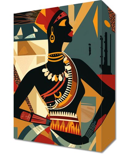 Obraz z serii abstrakcja zatytułowany Afrykańska Mozaika. Prezentuje on stylizowany profil afrykańskiej kobiety, ubranej w tradycyjne ozdoby i hełm, który jest równie bogaty w kulturę, co w estetykę. Tło i postać są zbudowane z geometrycznych kształtów i ciepłych, ziemistych kolorów, które oddają bogactwo i różnorodność afrykańskiego dziedzictwa. Złote i czerwone akcenty na postaci kontrastują z spokojnymi odcieniami tła, co podkreśla jej wyjątkowy charakter. Obraz ten będzie doskonałym dodatkiem do wnętrz, które chcą uczcić i wyeksponować bogactwo kulturowe, takich jak salony, przestrzenie społecznościowe czy miejsca o tematyce edukacyjnej i kulturalnej.