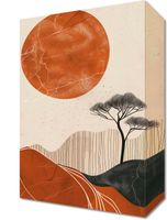 Obraz z serii boho zatytułowany Afrykański Zachód Słońca przedstawia malowniczą scenę z ciepłymi, ziemistymi barwami symbolizującymi niekończącą się pustynię. Wielkie, płonące słońce w kolorze rdzy wisi nad delikatnie zarysowanymi drzewami akacji, które są ikoniczne dla afrykańskiego krajobrazu. Linie konturów wzgórz i pustynnych wydm dodają głębi i perspektywy, a rysunkowe pęknięcia i plamy na słońcu nadają teksturę. Ta kompozycja łączy surowość pustyni z zachwycającym pięknem dzikiej przyrody, idealna dla wnętrz, które pragną odrobiny egzotyki i ciepła afrykańskich barw.