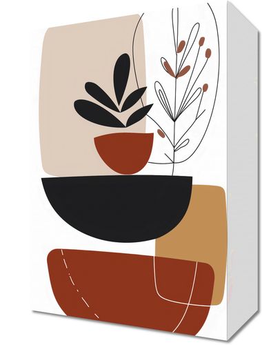 Obraz z serii minimalistyczne zatytułowany Botaniczna Abstrakcja. To artystyczne dzieło przedstawia stylizowane, botaniczne motywy ukryte wśród geometrycznych form. Delikatne rośliny w doniczkach uchwycone są w prostych, ale wyrafinowanych konturach, zaznaczających ich sylwetki na tle złożonego z ciepłych i neutralnych barw tła. Brązy i beże splatają się tu z głęboką czerwienią, tworząc organiczne poczucie natury uproszczonej do esencji formy. Ten obraz doskonale odnajdzie się w przestronnych, jasnych wnętrzach, gdzie natura spotyka się z minimalizmem - idealny do salonów w stylu skandynawskim, spokojnych gabinetów, lub jako ukojenie w dynamicznym, miejskim biurze.