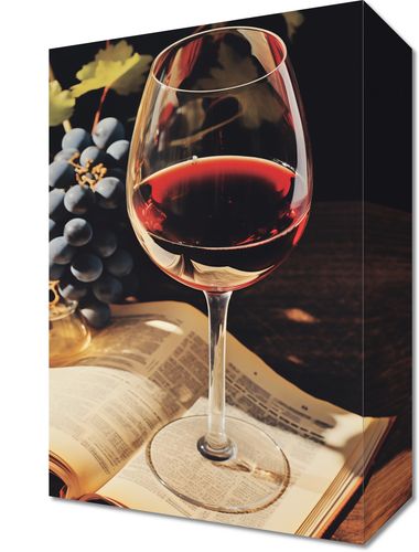 Obraz z serii wnętrza zatytułowany Bukiet Historii. Na tej zachęcającej ilustracji widzimy kieliszek czerwonego wina delikatnie spoczywający na otwartej stronie książki, z wyraźnym odbiciem na stronach. Obok kieliszka umieszczono grono dojrzałych winogron, a całość kompozycji znajduje się na ciemnym tle, co podkreśla bogactwo i głębię barw. Ten obraz oddaje przyjemność płynącą z połączenia relaksującej lektury z degustacją wybornego wina, idealny dla miłośników dobrych książek i enologii, świetnie sprawdzi się w domowych biblioteczkach, salonach degustacyjnych czy jako wyrafinowana dekoracja w winiarniach.