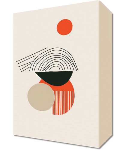Obraz z serii boho zatytułowany Centralne Słońce to dzieło artystyczne utrzymane w stonowanej palecie kolorystycznej, na którym dominują geometryczne kształty i linie. Na górnej części kompozycji widnieje małe, jaskrawe czerwone koło, które może symbolizować słońce lub inny punkt centralny. Poniżej znajduje się czarna, półokrągła forma z koncentrycznymi liniami, przypominającymi ułożenie naturalnych warstw kamienia lub drzewa. Tuż obok, kontrastujące z nią, znajduje się większe, jasno beżowe koło, które wraz z czarnym półkolem tworzy iluzję przestrzeni. Na dole obrazu uwagę przyciąga większe, okrągłe pole w odcieniu ciepłego pomarańczu, na którym znajduje się wzór pasków w kierunku pionowym, dodający tekstury i ruchu. Całość utrzymana jest w estetyce minimalizmu i modernizmu, gdzie każdy element, choć prosty, jest starannie wyważony, by współgrać z resztą kompozycji.