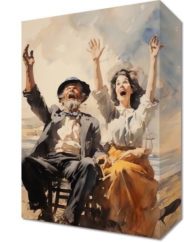Obraz z serii wnętrza zatytułowany Chwile Radości. Pełne życia i entuzjazmu postacie starego mężczyzny w kapeluszu i młodej kobiety w białej bluzce, obaj z uniesionymi rękami w geście ekscytacji. Tło z rozmazanymi akwarelowymi chmurami i brzegiem morza dodaje uczucie swobody i nieskrępowanej radości. Złote i błękitne odcienie obrazu harmonizują ze sobą, tworząc atmosferę beztroski. Idealny do ozdobienia przestrzeni kawiarnianych, artystycznych galerii lub domowych salonów pragnących wprowadzić do swojego wnętrza nutę optymizmu i spontaniczności.