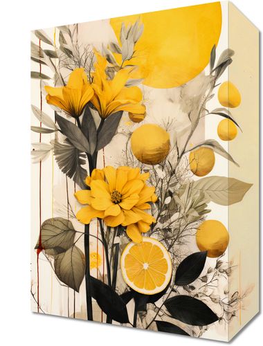Obraz z serii wnętrza zatytułowany Cytrusowy Zachwyt. Fascynująca kompozycja ukazująca kwitnące żółte kwiaty, zmysłowe odcienie i niuanse przyrody w harmonii z cytrusowymi motywami. Plener wypełniony jest pełnymi życia kolorami, gdzie świeżo pokrojony cytrynowy plaster przeplata się z lśniącymi kroplami rosy i subtelnie opadającymi liśćmi. Całość skąpana jest w cieple żółtego słońca, dodając obrazowi nuty świeżości i optymizmu. Doskonale sprawdzi się w kawiarniach o letnim klimacie, salonach kosmetycznych lub w przestronnych jadalniach z elementami roślinności w dekoracji.