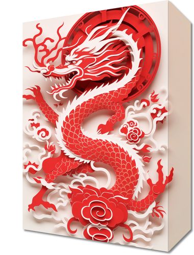 Obraz z serii motywy wschodnie zatytułowany Czerwony Smok. Ta intrygująca grafika przedstawia czerwonego smoka w stylu papierowej wycinanki, który wydaje się wyłaniać z tła z potężną siłą i gracja. Smok, symbolizujący szczęście, siłę i dobrobyt w kulturach azjatyckich, został przedstawiony w pełnym ruchu, z płomieniami i chmurami otaczającymi jego ciało. Kolor czerwony dominuje w dziele, co w kulturze chińskiej jest zwiastunem szczęścia i pomyślności. Ten obraz doskonale nada się jako wyraziste dzieło sztuki w każdym wnętrzu, szczególnie polecany jako dekoracja na święto Chińskiego Nowego Roku, w przestrzeniach publicznych takich jak restauracje czy hotele, a także w domach ceniących azjatycką estetykę i symbolikę.