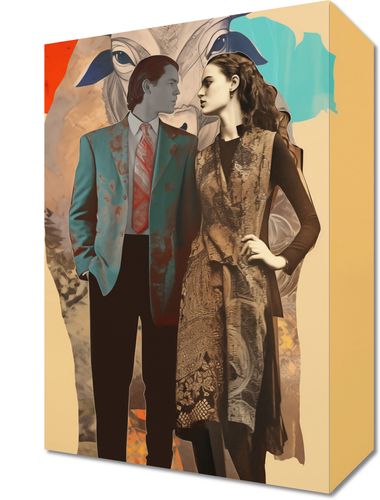 Obraz z serii abstrakcja zatytułowany Dialog Kultur. Ten unikalny obraz przedstawia mężczyznę i kobietę w tradycyjnych strojach, stojących na tle abstrakcyjnego wizerunku byka, który może symbolizować siłę i dziedzictwo kulturalne. Ich ubiory, pełne tekstur i wzorów, w połączeniu z modernistycznym tłem, odzwierciedlają zetknięcie się różnych epok i wartości. Obraz wyraża ideę harmonii pomimo różnorodności, łącząc w sobie elementy historyczne z nowoczesną abstrakcją. Jest to doskonały wybór dla przestrzeni celebrujących różnorodność i bogactwo kulturowe.