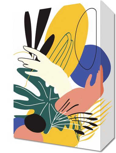 Obraz z serii minimalistyczne zatytułowany Dotyk Tropików. Ten energetyczny i kolorowy obraz przedstawia abstrakcyjną, niemal surrealistyczną wizję tropikalnej roślinności. Wielobarwne kształty łączą się z naturalnymi elementami tworząc efektowną kompozycję, która oddaje bujność i różnorodność tropików. Paleta barw, od głębokiego granatu, poprzez jaskrawy żółty, aż po delikatne pastele, wnosi do wnętrza świeżość i egzotykę.Ten obraz jest idealnym wyborem dla wnętrz, które pragną wnieść żywiołowość i odrobinę egzotyki do codziennej przestrzeni. Doskonale uzupełni jasne i przestronne salony, a także stanie się inspirującym akcentem w kreatywnych pracowniach lub kawiarniach. Może również dodać charakteru nowoczesnym, minimalistycznym biurom, wprowadzając żywe barwy i organiczne motywy.