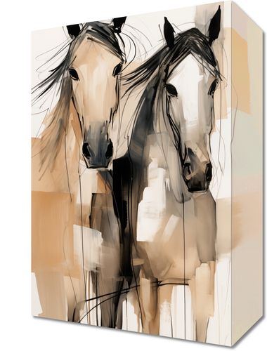 Obraz z serii wnętrza zatytułowany Dusze na Wolności. Ten artystyczny obraz przedstawia dwie abstrakcyjne sylwetki koni, uchwycone w dynamicznych, niemal eterycznych pociągnięciach pędzla. Neutralna paleta barw z dominującymi odcieniami beżu i czerni, podkreślona jest przez akcenty i plamy, co nadaje dziełu głębi i tekstury. Artystyczne, swobodne linie i plamy tuszu tworzą wrażenie ruchu i wolności, wywołując emocjonalne rezonanse z widzem. Obraz jest idealnym wyborem dla miłośników koni, sztuki współczesnej i abstrakcyjnego ekspresjonizmu, będąc nie tylko dekoracją, ale także wyrafinowanym elementem w przestrzeniach takich jak salony, biura, czy galerie sztuki.