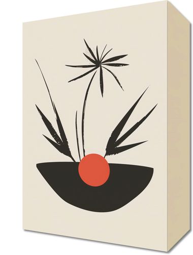 Obraz z serii boho zatytułowany Esencja Wzrostu.Na tej grafice proste, dynamiczne pociągnięcia pędzlem tworzą sylwetki roślin, które wyrastają z ciemnej, poziomej formy. Centralny punkt kompozycji stanowi jaskrawy, czerwony akcent, przypominający zarówno owoc, jak i słońce, które nadaje życie. Całość, osadzona na ciepłym, beżowym tle, stanowi harmonijną kompozycję pełną spokoju i natury. Dzieło będzie pięknym dodatkiem do przestrzeni, gdzie panuje spokój i szukane są proste, lecz wyraziste dekoracje. To minimalistyczne wyobrażenie roślinności doskonale odnajdzie się w nowoczesnych salonach, gabinetach, czy pokojach relaksacyjnych, gdzie może dodać odrobiny organicznego charakteru i wizualnego spokoju.