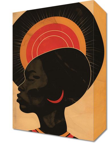 Obraz z serii abstrakcja zatytułowany Gorące Promienie to urzekający portret profilu kobiety, który wyraża siłę i spokojną godność. Jej sylwetka jest wyraźna i zdecydowana, z podkreślonymi, mocnymi liniami, a tło za jej głową tworzy aureolę w ciepłych odcieniach, od ciemnego poprzez jaskrawe odcienie pomarańczu do złota, co może symbolizować wschód lub zachód słońca. Te koncentryczne kręgi przypominają również halo, które często widnieje na obrazach świętych lub ikonach, nadając postaci niemal boski wymiar. Czarny kolor sylwetki w połączeniu z bogatymi, złotymi odcieniami tworzy mocny kontrast, który przyciąga wzrok i sugeruje tajemnicę oraz niezwykłą wewnętrzną siłę. Obraz ten jest elegancki i wyrazisty, doskonały do każdego wnętrza, w którym chce się podkreślić piękno, siłę i kulturowe bogactwo.