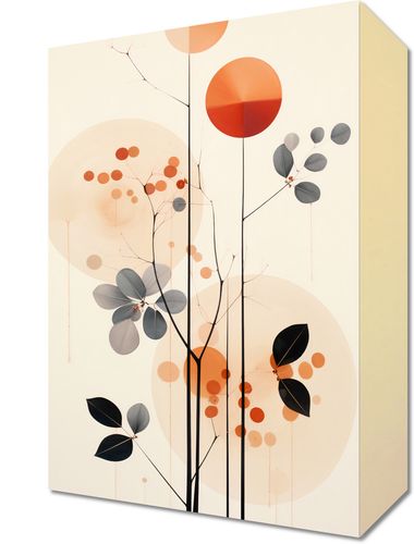 Obraz z serii wnętrza zatytułowany Jesienna Melodia. Subtelne motywy roślinne, z delikatnymi liśćmi w odcieniach niebieskiego, są otoczone przez okrągłe formy w odcieniach pomarańczy i beżu, które przypominają wschodzące słońce czy pełnię księżyca. Cienkie gałązki przecinają kompozycję, dodając jej struktury i rytmu. Ciepłe tony mieszają się z chłodniejszymi, tworząc harmonijną i spokojną całość. Jego wyrafinowany i subtelny design wprowadza atmosferę relaksu i spokoju. Idealnie pasuje do domowych salonów, gabinetów relaksacyjnych czy też nowoczesnych biur, gdzie natura łączy się z elegancją i prostotą.