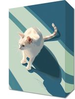Obraz z serii wnętrza zatytułowany Kocia Persona przedstawia białego kota o intensywnie błękitnych oczach, który z gracją przemierza przestrzeń ożywioną grą cieni. Jego postawa jest skupiona i zwinna, a cień rzucony na pastelowoniebieskie tło tworzy silny wizualny kontrast, podkreślając dynamikę ruchu. Ostre linie na podłożu dodają głębi kompozycji, jednocześnie zachowując minimalistyczny charakter dzieła. Ten obraz będzie idealnym dodatkiem do nowoczesnych, jasnych wnętrz, które cenią sobie prostotę i elegancję, na przykład jako element dekoracyjny w salonie, sypialni lub przestrzeni biurowej, gdzie może dodać subtelności i lekkości.