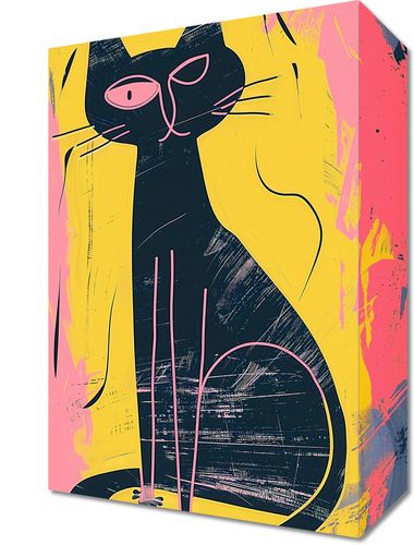 Obraz z serii abstrakcja zatytułowany Kontrastowa Kotka. Praca artystyczna przedstawia stylizowaną, abstrakcyjną sylwetkę czarnego kota na tle żywych, nieregularnych pociągnięć pędzla w odcieniach różu i żółci. Wzrok kota, zaznaczony jednym dużym różowym okiem, przyciąga uwagę i dodaje kompozycji charakteru. Mocne, geometryczne linie i intensywne kontrasty kolorystyczne tworzą nowoczesną i dynamiczną ilustrację, która przyciąga wzrok i staje się wyrazistym elementem dekoracyjnym. Obraz ten idealnie sprawdzi się w przestrzeniach miejskich, takich jak nowoczesne mieszkania, studia graficzne lub awangardowe kawiarnie, nadając wnętrzom śmiałości i wyjątkowego, artystycznego akcentu.