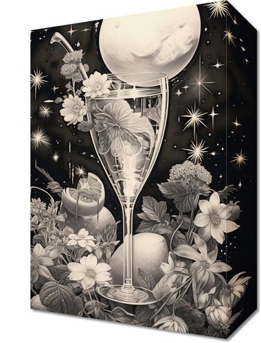 Obraz z serii wnętrza zatytułowany Kosmiczny Eliksir. Niesamowita kompozycja przedstawiająca kieliszek, z którego wylewa się galaktyczny nektar, otoczony kwiatami i roślinami w monochromatycznych barwach. Centralnym punktem jest lśniąca pełnia księżyca, której blask odbija się w szkle, tworząc atmosferę tajemnicy i magii. Gwiazdy migoczą w tle, nadając całości głębokiego, nieskończonego wymiaru. Delikatne linie i szczegóły graficzne wzbogacają kompozycję, czyniąc ją idealnym wyborem do nowoczesnych salonów, galerii sztuki oraz miejsc o tematyce astronomicznej.