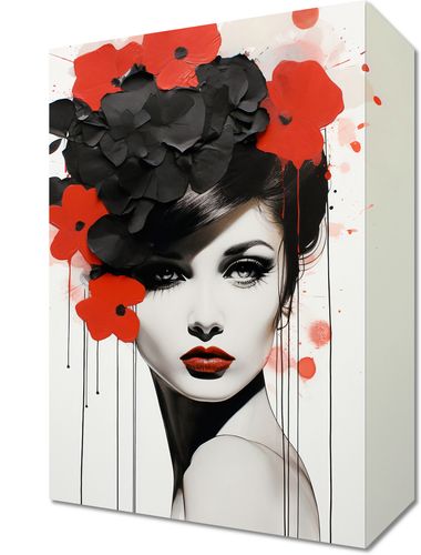 Obraz z serii wnętrza zatytułowany Kwiatowa Pasja. Magnetyczne spojrzenie kobiety zaakcentowane jest eksplozją czerwonych i czarnych kwiatów, które zdają się być przedłużeniem jej duszy. Jej soczyste czerwone usta są echem barwnych petali, które otaczają ją niczym aura. Splaty czerwieni na monochromatycznym tle dodają kompozycji dynamiki i nieprzewidywalności. Idealnie odnajdzie się w luksusowych apartamentach oraz w eleganckich salonach kosmetycznych.
