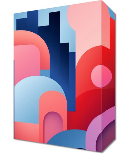 Obraz z serii geometria zatytułowany Miasto Kolorów. Złożone z różnorodnych kształtów i tonacji, przedstawiające wyimaginowane miasto pełne zakamarków i mostów. Błękitne wieżowce kontrastują z ciepłymi różami i czerwieniami, tworząc uczucie ruchu i dynamiki. Gładkie linie i łuki wprowadzają uczucie spokoju w środku urbanistycznego zgiełku. Doskonale odnajdzie się w nowoczesnych biurach oraz w przestrzeniach artystycznych galerii.