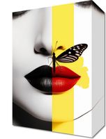 Obraz z serii abstrakcja zatytułowany Motyla Piękność. Ten obraz przedstawia twarz kobiety podzieloną na dwa kontrastujące segmenty: jeden w czerni i bieli, drugi w żywych kolorach z motylem na ustach. Ilustracja eksploruje temat dualizmu natury ludzkiej, piękna i jego zmienności. Obraz ten jest idealnym wyborem dla przestrzeni o współczesnym designie, takich jak salony piękności, studia artystyczne, a także jako wyrazisty element dekoracyjny w nowoczesnych domach.