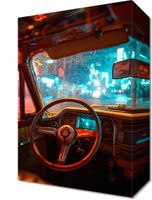 Obraz z serii pop art zatytułowany Nocny Kierowca, przedstawia widok z wnętrza klasycznego samochodu, patrząc przez deszczową, skraplaną szybę na rozświetlone neony miejskiego pejzażu nocą. Ciepłe, czerwone oświetlenie wnętrza samochodu kontrastuje z hipnotyzującym błękitem i elektrycznymi odcieniami świateł zewnętrznych, tworząc intymną, a jednocześnie dynamiczną atmosferę. Kropelki deszczu na szybie dodają tekstury i głębi, sprawiając, że scena jest zarówno realistyczna, jak i liryczna. To dzieło sztuki mogłoby znaleźć swoje miejsce w przestrzeniach nowoczesnych, miejskich loftów lub jako akcent w barze o tematyce retro, wprowadzając element tajemniczości i miejskiego romansu.