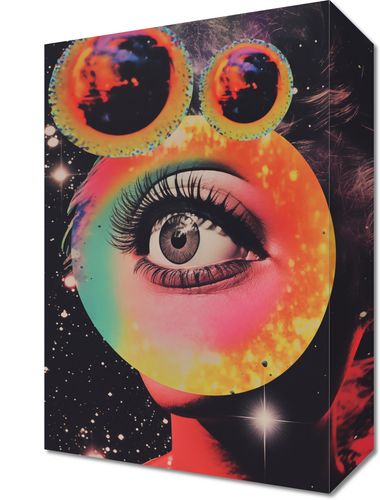 Obraz z serii pop art zatytułowany Oko w Kosmosie. Ten dynamiczny obraz to połączenie surrealistycznego portretu i kosmicznej odyseji. Centralnym punktem jest oko, które jest zarówno oknem na duszę, jak i lustrzanym odbiciem wszechświata, otoczone przez płomienne kolory galaktycznej mgławicy. Nad okiem widnieją okulary przeciwsłoneczne, w których lustrzanych szkłach odbijają się planety, nadając kompozycji głębi i zadziwiającej perspektywy. Ten obraz, pełen barw i kontrastów, to wspaniały wybór dla tych, którzy pragną dodać odrobinę kosmicznego surrealizmu do swojego wnętrza, idealnie sprawdzając się w przestrzeniach artystycznych, takich jak galerie sztuki, studia projektowe lub awangardowe salony.