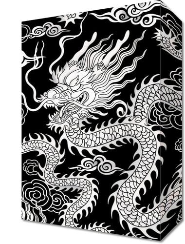 Obraz z serii motywy wschodnie zatytułowany Orient przedstawia dynamiczną i szczegółową ilustrację smoka w stylu orientalnym, wypełniającego większość kompozycji na czarnym tle. Smok jest przedstawiony w tradycyjnej chińskiej estetyce, z wydłużonym ciałem pokrytym łuskami, długim, zakręconym wiatrem, ostrymi pazurami i wyrazistymi rysami twarzy. Wykorzystanie kontrastowych bieli i czerni wzmacnia graficzny charakter ilustracji, podkreślając wyrafinowane detale i płynność ruchów smoka. Jego ciało płynnie przenika przez chmury i wiry dymu, co dodaje kompozycji wrażenia głębi i ruchu. Ta praca może symbolizować moc, mądrość i ducha przemiany, które są często kojarzone ze smokami w kulturze wschodniej. Idealnie nadawałby się jako element dekoracyjny w przestrzeniach, które chcą nawiązać do azjatyckiej kultury lub dodać silny, energiczny akcent do swojego otoczenia.