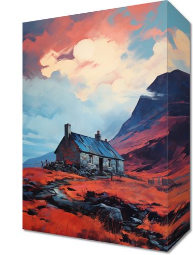 Obraz z serii pejzaże zatytułowany Ostatni Bastion. Obraz przedstawia osamotniony domek umiejscowiony w surowym, ale majestatycznym krajobrazie, pod dramatycznym niebem o intensywnych odcieniach czerwieni i błękitu. Zmierzch słońca rzuca ciepłe światło na dzikie, wrzosowe pola, tworząc kontrast z chłodnymi tonami górskiego tła. Ten obraz wyraża surowe piękno i niezłomność natury, a także ludzką tęsknotę za prostotą i ciszą. Idealnie nadaje się do wnętrz, które pragną wprowadzić poczucie spokoju, odosobnienia i kontemplacji natury.