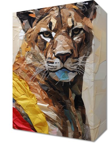 Obraz z serii wnętrza zatytułowany Papierowy Tygrys. Ta oryginalna i kreatywna ilustracja przedstawia portret tygrysa wykonany techniką kolażu z kolorowych kawałków papieru. Wykorzystanie różnych odcieni i tekstur papieru nadaje dziełu głębi i dynamiki, a jednocześnie zachowuje realistyczny obraz dzikiego zwierzęcia. Obraz ten jest wyjątkowym dziełem sztuki, które przyciąga wzrok i inspiruje, idealny dla miłośników natury i oryginalnego designu, świetnie sprawdzi się w nowoczesnych salonach, gabinetach lub jako wyrazisty akcent w przestrzeniach publicznych takich jak galerie sztuki czy kawiarnie.