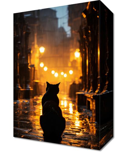 Obraz z serii wnętrza zatytułowany Samotna Wędrowczyni. Kontur czarnego kota stojącego na mokrej, brukowanej uliczce, oświetlonej jedynie żółtym blaskiem lamp ulicznych, tworzy atmosferę tajemniczości i refleksji. Deszcz spadający na tle starych budynków dodaje uczucia nostalgii i melanholii. Ten kocur, jakby strażnik nocy, symbolizuje samotność i odwagę w konfrontacji z niewiadomym. Świetnie sprawdzi się w kawiarniach, księgarniach oraz w salonach o industrialnym charakterze wnętrza.
