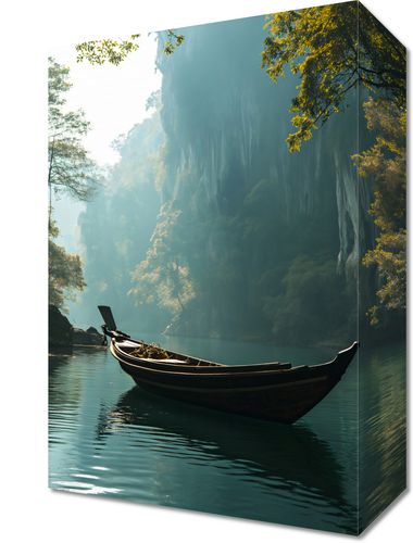 Obraz z serii pejzaże zatytułowany Samotność na Tafli przedstawia idylliczny krajobraz, w którym centralnym punktem jest drewniana łódka unosząca się na spokojnych wodach jeziora. Otoczona przez majestatyczne, zielone drzewa i klify, które otulają wodę jak opiekuńcze ramiona, scena ta jest utrzymana w ciepłych, naturalnych barwach. Promienie słoneczne przebijają się przez liście, tworząc efekt tajemniczego światła i cieni na wodnej tafli. Całość kompozycji wywołuje uczucie spokoju i kontemplacji, idealnie oddając atmosferę zacisznego zakątka, oderwanego od zgiełku codzienności. Obraz ten będzie pasował do wnętrz, które pragną podkreślić łączność z naturą i stworzyć oazę spokoju, takich jak gabinety relaksacyjne, pokoje medytacyjne czy nawet jako spokojny akcent w nowoczesnych biurach.