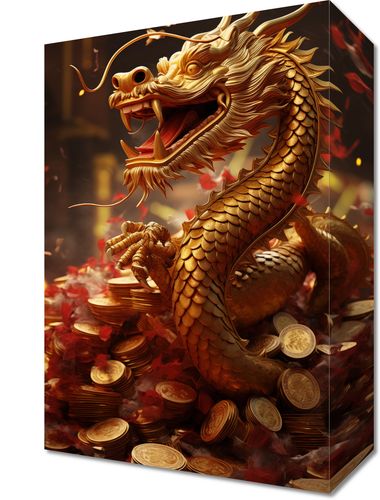 Obraz z serii motywy wschodnie zatytułowany Smok Bogactwa. Ilustracja ta ukazuje potężnego złotego smoka, symbol siły i pomyślności w wielu kulturach wschodnich, unoszącego się nad skarbami. Smok, z szeroko otwartymi szczękami, wydaje się ryczeć triumfalnie, otoczony przez wirujące złote monety i kwiaty, co dodaje kompozycji dynamizmu. Żywe kolory i szczegółowe wykonanie smoka sprawiają, że obraz jest pełen życia i energii. Obraz ten jest doskonałym wyborem dla miłośników sztuki orientalnej oraz jako element dekoracyjny wnętrz, które chcą wprowadzić elementy bogatej symboliki i kulturowej głębi, takich jak domowe biura, pokoje do medytacji czy ekskluzywne salony.