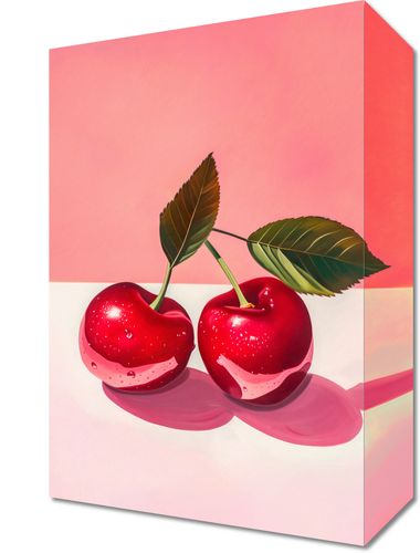 Obraz z serii wnętrza zatytułowany Soczyste Oczywiste ukazuje dwa soczyste, lśniące wiśnie z dwoma zielonymi liśćmi, które są połączone w jedną gałązkę, na pastelowym różowym tle z białą powierzchnią, na której odbijają się owoce. Wiśnie są przedstawione w realistycznym stylu, z widocznymi refleksami światła i kroplami wody, co nadaje im świeży i apetyczny wygląd. Zastosowanie cieni i światłocienia nadaje kompozycji głębi i trójwymiarowości. Dominujące ciepłe odcienie różu i czerwieni tworzą przyjemną i słodką atmosferę. Obraz może być interpretowany jako celebracja lata i dojrzałych owoców lub jako minimalistyczne podejście do tematu natury morte w nowoczesnym wydaniu. Idealnie nadawałby się jako element dekoracyjny do kuchni lub jadalni, wprowadzając żywy i kolorowy akcent.
