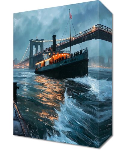 Obraz z serii abstrakcja zatytułowany Stary Parowiec uchwycił nostalgiczny obraz starego parowca przemierzającego wody przy mrocznym niebie, z tłem rozświetlonego mostu. Światła na parowcu rzucają ciepły blask na fale, tworząc złoty refleks na powierzchni wody, co kontrastuje z chłodnymi odcieniami burzowych chmur i zmierzchu. To malownicze przedstawienie, połączone z dynamiczną grą świateł i cieni, tworzy romantyczną i pełną atmosfery scenę, która przyciąga oko i wywołuje uczucie sentymentu do dawnych czasów. Idealnie nadaje się do zawieszenia w przestrzeniach, gdzie chcemy dodać element historycznej elegancji i marzycielskiego nastroju, takich jak biblioteki, studia, a nawet salony.