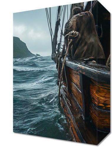 Obraz z serii pejzaże zatytułowany Statek na Falach to dramatyczna scena przedstawiająca statek przemierzający wzburzone fale oceanu. Zwrócony w stronę niespokojnych wód, statek o klasycznej konstrukcji z drewnianymi burtami i linami, wydaje się być zanurzony w przygodzie lub ekspedycji. Twardy, odwrócony tyłem marynarz, ubrany w przeciwdeszczowy płaszcz, wpatruje się w horyzont, dodając elementu ludzkiego do dzikiego i nieokiełznanego krajobrazu morskiego. Szarozielone klify w oddali stanowią tło dla sceny, podkreślając surowość i izolację otoczenia. Ten obraz może wnieść atmosferę przygody i odkryć do każdego wnętrza, będąc szczególnie odpowiednim dla przestrzeni pełnych charakteru, takich jak gabinet, pokój tematyczny w stylu podróżniczym lub nawet jako akcent w stylowym barze lub restauracji nawiązującej do tematyki morskiej.