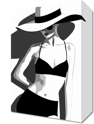 Obraz z serii abstrakcja zatytułowany Strój. Prezentuje stylizowany czarno-biały wizerunek kobiety w dwuczęściowym stroju kąpielowym. Postać odziana jest w szerokobrzmiony kapelusz, który rzuca cień na jej twarz, podkreślając elegancki i tajemniczy charakter kompozycji. Kobieta stoi w pozycji trzy czwarte, z jedną ręką opuszczoną wzdłuż ciała, a drugą lekko zgiętą w łokciu, co dodaje dynamizmu ilustracji. Obraz jest utrzymany w minimalistycznym stylu z wykorzystaniem płaskich plam kolorów i wyraźnych linii, co nadaje mu nowoczesny i modny wygląd. Ten rodzaj grafiki idealnie wpasuje się w nowoczesne wnętrza, szczególnie te o monochromatycznej kolorystyce, lub jako modny akcent w przestrzeniach o minimalistycznej estetyce.
