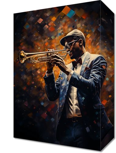 Obraz z serii pop art zatytułowany Symfonia na Trąbce. Na dziele przedstawiony jest elegancko ubrany muzyk jazzowy, zagłębiony w grze na trąbce. Postać otacza kalejdoskop ciepłych, żywych barw, które pulsują w rytmie nieuchwytnej melodii. Detale takie jak błyszcząca trąbka, stylowy kapelusz i charakterystyczne okulary podkreślają indywidualność i pasję artysty. To dzieło celebruje muzykę i jej zdolność do wyrażania głębokich emocji, idealnie nadając się do wnętrz miłośników muzyki, jazzowych klubów oraz przestrzeni artystycznych, gdzie może dodać atmosfery i inspiracji.