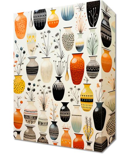 Obraz z serii wnętrza zatytułowany Symfonia Wazonów. Wspaniałe wazony w bogatej palecie kolorów, od głębokiej czerni do ciepłych odcieni pomarańczu, tworzą intrygującą mozaikę wzorów i kształtów. Delikatne motywy roślinne, które zdobią niektóre wazony, dodają uroku i lekkości, a różnorodność wzorów i faktur przyciąga wzrok i zaprasza do głębszej refleksji. Kontrast między jasnymi i ciemnymi barwami, a także subtelne niuanse w każdym wazonie, dodają tej kompozycji głębi i dramatu. Ten artystyczny plakat doskonale wpisuje się w klimat wyrafinowanych galerii sztuki, eleganckich kawiarni oraz nowoczesnych przestrzeni mieszkalnych, które stawiają na unikatowy design.
