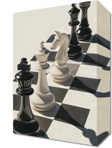 Obraz z serii abstrakcja zatytułowany Szach i Mat. Na obrazie widzimy fotorealistyczną kompozycję szachów w akcji. Białe i czarne figury są elegancko rozmieszczone na szachownicy, co sugeruje intensywność i strategię gry. Cienie rzucone przez figury na błyszczącą powierzchnię szachownicy nadają głębi i trójwymiarowości obrazu. Skupienie na kilku głównych figurach, takich jak wieża, hetman i skoczek, może symbolizować krytyczny punkt w grze, gdzie każdy ruch ma kluczowe znaczenie. Tło jest jasne i neutralne, co pozwala skupić się na dynamice gry bez rozpraszających elementów. Obraz ten mógłby być idealnym dodatkiem do przestrzeni dla miłośników szachów lub jako dekoracyjny element w przestrzeni wspólnej, bibliotece lub pokoju gier, dodając elegancji i intelektualnego charakteru.