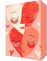 Obraz z serii wnętrza zatytułowany Wysoka Wibracja przedstawia dwie połówki serca, które razem tworzą jedno, gdzie każda połówka ma ludzkie rysy twarzy z zamkniętymi oczami, wyrażającymi spokój i radość. Całość utrzymana jest w ciepłej, pastelowej kolorystyce z akcentami czerwieni i różu, a tło wypełniają delikatne elementy w kształcie serduszek, które dodają ilustracji romantycznego nastroju. Obraz symbolizuje jedność, miłość i harmonię, a zamknięte oczy mogą sugerować intymność i zaufanie. Obraz jest idealnym wyrazem miłości i bycia w związku, doskonałym do pomieszczeń domowych, takich jak sypialnie czy salony, a także może stanowić romantyczny prezent dla bliskiej osoby.