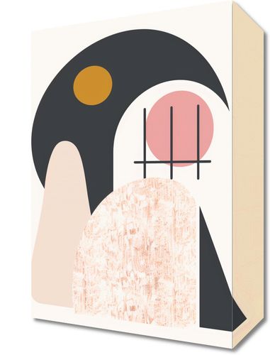 Obraz z serii boho zatytułowany Zakres Widoku.Obraz przedstawia abstrakcyjną kompozycję łączącą kształty zakrzywione i geometryczne, wykorzystującą miękką i spójną paletę kolorów. Dominujące kolory to czarny, odcienie różu, beż oraz akcent żółtego, tworząc poczucie równowagi i nowoczesnej estetyki. Kompozycja składa się z nakładających się form, w tym dużej czarnej figury z wycięciem koła, przez które prześwituje część różowego koła, oraz żółtego koła umieszczonego w obszarze czarnym, co może sugerować ciało niebieskie typu księżyc lub słońce. Obecne są również elementy fakturalne, dodające głębi i intrygi jednemu z kształtów, a proste linie przecinają różowe koło, przyczyniając się do wizualnego zainteresowania dziełem. Całość kompozycji przekazuje spokojne i współczesne wrażenie, prawdopodobnie czerpiąc inspirację z natury i sztuki abstrakcyjnej.