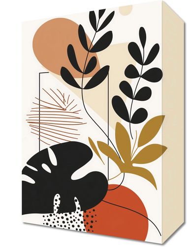 Obraz z serii minimalistyczne zatytułowany Zawisły Liść.Na obrazie dominują płynne linie i organiczne formy roślin kontrastujące z geometrycznymi figurami, tworząc wyjątkową harmonię między naturą a abstrakcją. Kolorystyka w ciepłych odcieniach beżu, pomarańczy, czerni i złota nadaje kompozycji ciepło i elegancję. Przywodzi na myśl połączenie tradycyjnego z nowoczesnym, gdzie elementy przyrody są przedstawione w stylu redukcyjnym. Idealny do wnętrz, które cenią współczesną sztukę z nutą natury, doskonale nadający się do umieszczenia w salonach, holach czy w pokojach z myślą o dodaniu życia i charakteru przestrzeni.