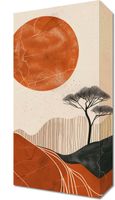 Obraz z serii boho zatytułowany Afrykański Zachód Słońca przedstawia malowniczą scenę z ciepłymi, ziemistymi barwami symbolizującymi niekończącą się pustynię. Wielkie, płonące słońce w kolorze rdzy wisi nad delikatnie zarysowanymi drzewami akacji, które są ikoniczne dla afrykańskiego krajobrazu. Linie konturów wzgórz i pustynnych wydm dodają głębi i perspektywy, a rysunkowe pęknięcia i plamy na słońcu nadają teksturę. Ta kompozycja łączy surowość pustyni z zachwycającym pięknem dzikiej przyrody, idealna dla wnętrz, które pragną odrobiny egzotyki i ciepła afrykańskich barw.