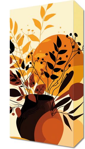 Obraz z serii minimalistyczne zatytułowany Bukiet Owoców. Grafika ta przedstawia estetyczny układ liści i owoców jesieni w klasycznym, ciemnym wazonie, umieszczony na tle ciepłych, okrągłych form w tonacji jesiennej palecie. Gama kolorów rozciąga się od intensywnego mahoń do miękkiego złota, przywołując uczucie ciepła, które towarzyszy złotej porze roku. Przemyślne rozpryski i drobne detale nadają całości dynamiki, sugerując żywotność i obfitość jesiennych plonów. Obraz ten idealnie odnajdzie się w przytulnych wnętrzach, wnosić będzie atmosferę spokoju i refleksji. Idealnie nadaje się do salonów, pokojów dziennych lub przestrzeni, gdzie dominuje naturalna paleta barw i materiałów.