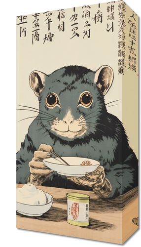 Obraz z serii motywy wschodnie zatytułowany Chwila Refleksji. Intrygujące spojrzenie gryzonia w tradycyjnym stroju, podkreślane przez błękitną tunikę i precyzyjne detale, które nadają mu humanoidalnego charakteru. Czerwone naczynia oraz kanji w tle kontrastują z jasnymi barwami obrazu, dodając nuty głębi i dziedzictwa kulturowego. Subtelna gra światła i cienia na stoliku z jedzeniem i napojem wzbogaca kompozycję i zachęca do refleksji nad połączeniem tradycji z nowoczesnością. Świetnie sprawdzi się w kawiarniach o azjatyckim klimacie, galeriach sztuki oraz w przestrzeniach dedykowanych kulturze Wschodu.