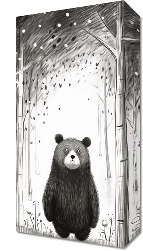 Obraz z serii wnętrza zatytułowany Ciekawski Miś. Ten uroczy obraz ilustracyjny przedstawia przyjaznego, czarno-białego misia stojącego na dwóch nogach w środku leśnej polany, patrzącego z ciekawością w górę na delikatnie opadające płatki śniegu. Stylizowany na rysunek piórkiem z miękkimi odcieniami szarości, wprowadza atmosferę spokoju i zaciekawienia naturą. Idealny do ozdoby pokoju dziecięcego, jako element dekoracyjny w przestrzeniach edukacyjnych lub jako ciepły akcent w domowych salonach.