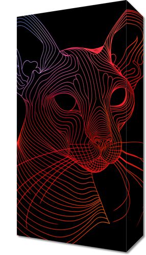 Obraz z serii pop art zatytułowany Cyfrowa Kocica przedstawia futurystyczny wizerunek kota sfinksa, wykonany za pomocą płynnych, abstrakcyjnych linii w odcieniach czerwieni i pomarańczu na głębokim, czarnym tle. Wzór linii tworzy iluzję trójwymiarowości i ruchu, podkreślając wyraziste cechy kociego profilu, takie jak duże uszy, wyłaniające się oczy i charakterystyczne rysy twarzy. Minimalistyczne użycie koloru i linii w kontraście z ciemnym tłem nadaje dziełu nowoczesny wygląd, który przyciąga wzrok i pobudza wyobraźnię. Ten artystyczny obraz świetnie wpisze się w wnętrza o nowoczesnym designie, szczególnie wśród miłośników zwierząt i miłośników sztuki cyfrowej, nadając przestrzeni odrobinę współczesnego stylu i kociego wdzięku.