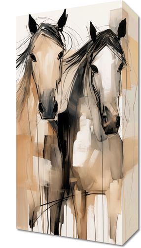 Obraz z serii wnętrza zatytułowany Dusze na Wolności. Ten artystyczny obraz przedstawia dwie abstrakcyjne sylwetki koni, uchwycone w dynamicznych, niemal eterycznych pociągnięciach pędzla. Neutralna paleta barw z dominującymi odcieniami beżu i czerni, podkreślona jest przez akcenty i plamy, co nadaje dziełu głębi i tekstury. Artystyczne, swobodne linie i plamy tuszu tworzą wrażenie ruchu i wolności, wywołując emocjonalne rezonanse z widzem. Obraz jest idealnym wyborem dla miłośników koni, sztuki współczesnej i abstrakcyjnego ekspresjonizmu, będąc nie tylko dekoracją, ale także wyrafinowanym elementem w przestrzeniach takich jak salony, biura, czy galerie sztuki.