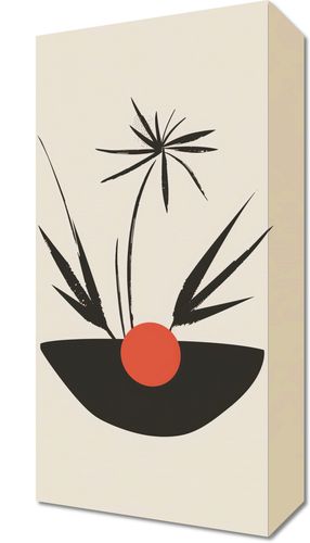 Obraz z serii boho zatytułowany Esencja Wzrostu.Na tej grafice proste, dynamiczne pociągnięcia pędzlem tworzą sylwetki roślin, które wyrastają z ciemnej, poziomej formy. Centralny punkt kompozycji stanowi jaskrawy, czerwony akcent, przypominający zarówno owoc, jak i słońce, które nadaje życie. Całość, osadzona na ciepłym, beżowym tle, stanowi harmonijną kompozycję pełną spokoju i natury. Dzieło będzie pięknym dodatkiem do przestrzeni, gdzie panuje spokój i szukane są proste, lecz wyraziste dekoracje. To minimalistyczne wyobrażenie roślinności doskonale odnajdzie się w nowoczesnych salonach, gabinetach, czy pokojach relaksacyjnych, gdzie może dodać odrobiny organicznego charakteru i wizualnego spokoju.