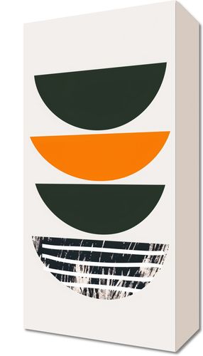 Obraz z serii boho zatytułowany Gra Tekstur to połączenie czystych, geometrycznych form z wyrazistą grą tekstur. Trzy półkoliste kształty w odcieniach głębokiej zieleni i żywej pomarańczy są ułożone w precyzyjny stos, tworząc zaskakującą głębię i zmysłową symetrię. Najniższa forma przerywa ten porządek, wprowadzając do dzieła dynamiczne, surowe detale, przypominające efekt artystycznego, spontanicznego malowania lub drapowania. Ten obraz jest idealnym wyborem dla wnętrz, które doceniają silne, graficzne elementy oraz surowy, industrialny klimat, pasując zarówno do minimalistycznych, jak i bardziej eklektycznych przestrzeni.